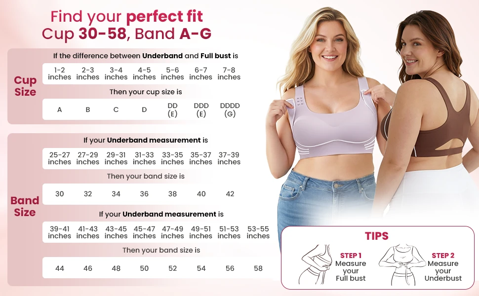 Band sizes: 28, 30, 32, 34, 36, 38, 40, 42, 44, 46, 48, 50, 52, 54, 56, 58